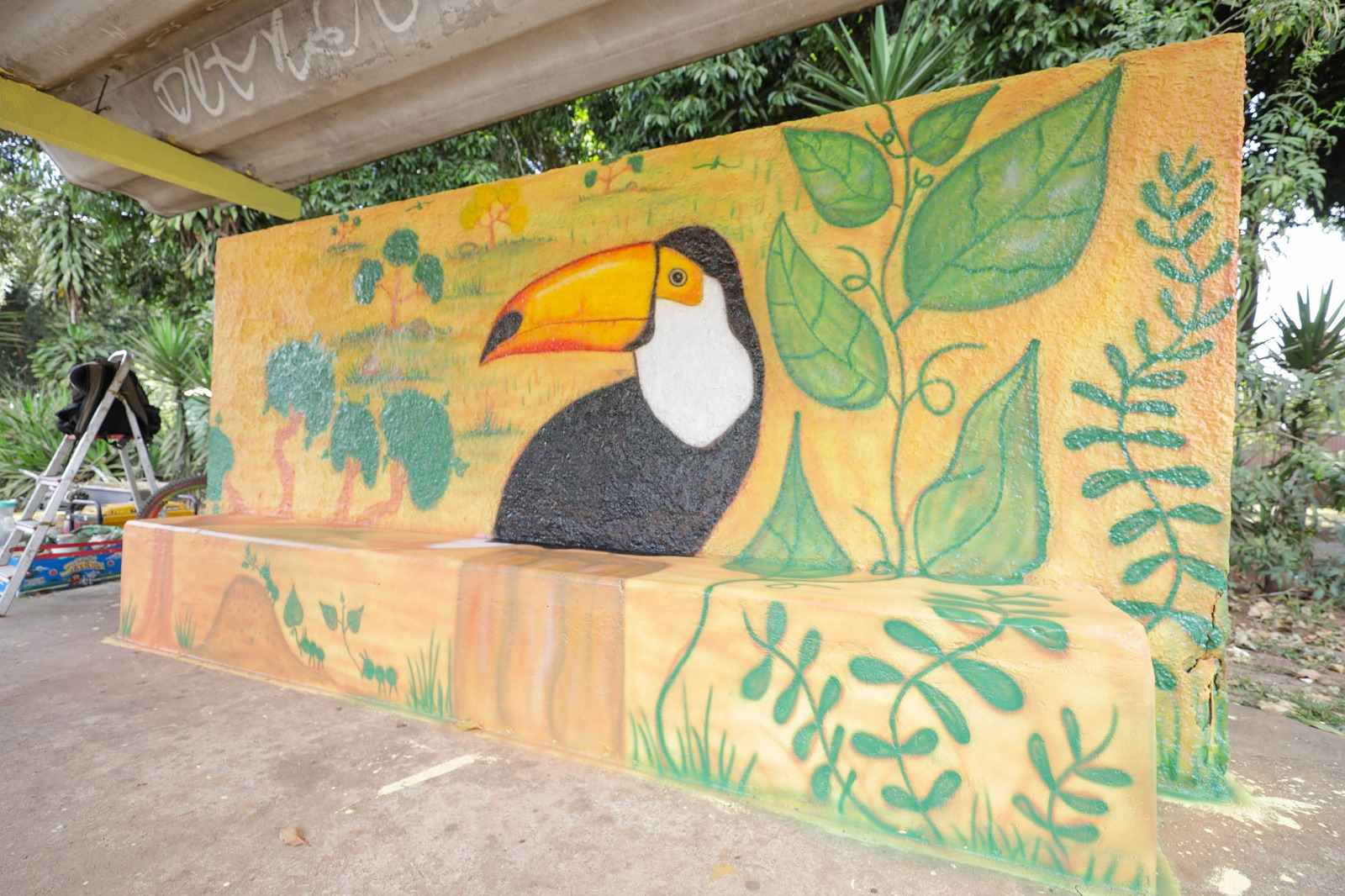 Entre as pinturas, estão elementos que fazem menção à educação no trânsito — como o respeito à faixa de pedestres — e à própria região de Taguatinga, a exemplo da Praça do Relógio. Também há ilustrações de plantas e animais do Cerrado, como os ipês e os tucanos. “Às vezes, o passageiro chega estressado, senta aqui, vê a natureza e já tira um pouco desse estresse”, completa Edmar.